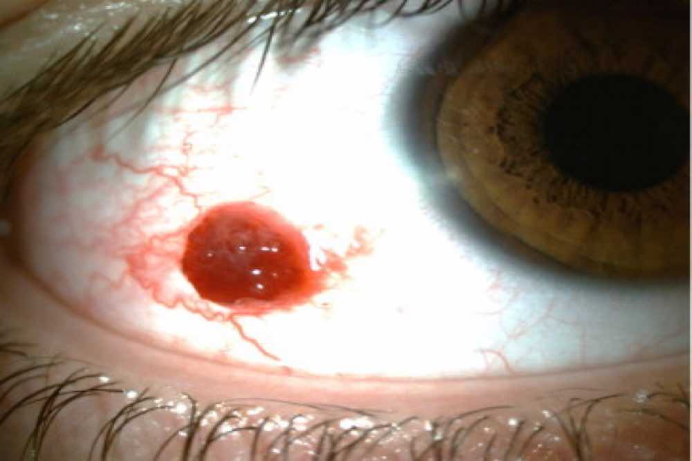 + Hemangioma conjuntival: Es un tumor benigno formado por vasos sanguíneos anormales en la conjuntiva. Puede presentarse como una protuberancia rojiza y puede causar molestias o visión borrosa si crece lo suficiente.